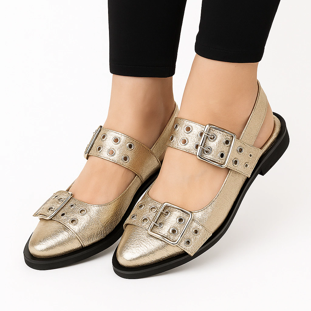 Un diseño sofisticado y moderno, confeccionado en cuero vacuno de alta calidad con acabado metalizado dorado, que aporta un brillo único y elegante.